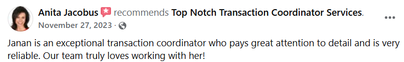 Janan has been one exceptional transaction coordinator for me. She has the drive and gives attention to every detail. She is very fun to work with and she is very professional while handling my client needs. I am and always will use her expertise as a transaction coordinator, till she decides to retire or fire me lol.